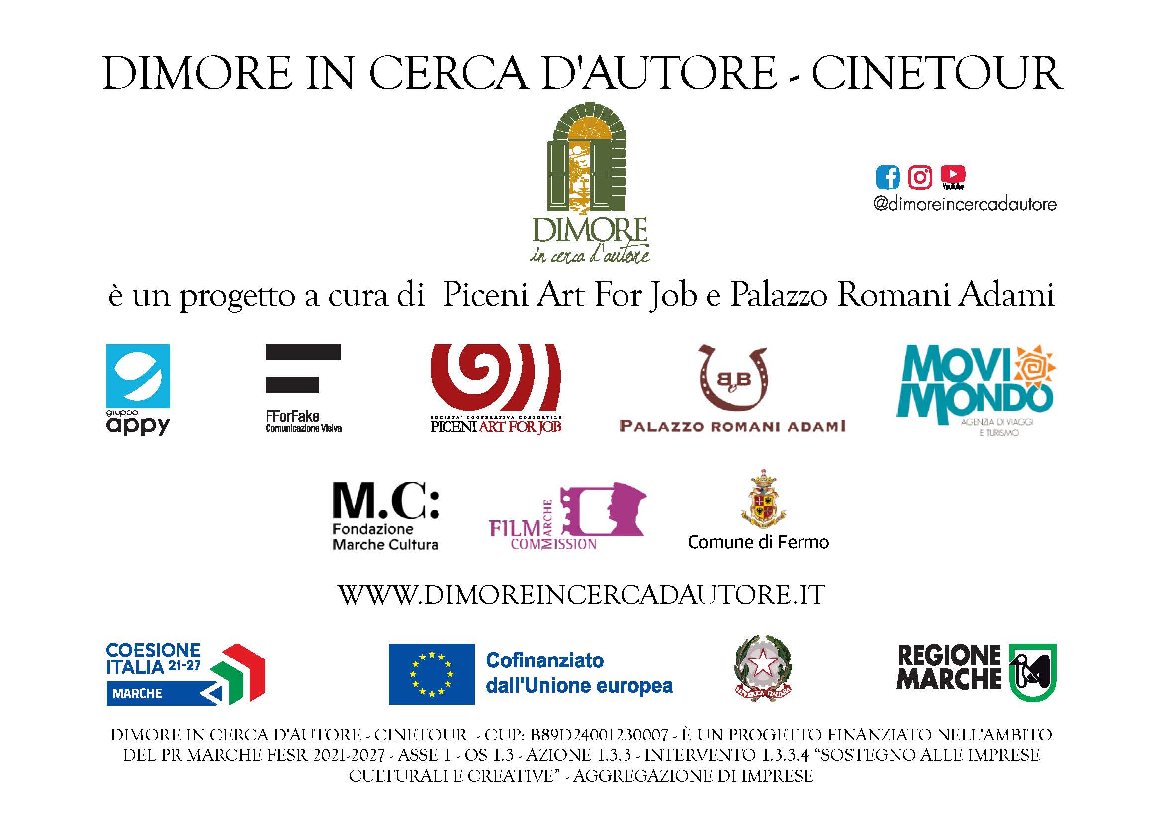 Dimore in cerca d’autore – Cinetour – CUP B89D24001230007 è un progetto cofinanziato dal PR MARCHE FESR 2021/2027 – Asse 1 – OS 1.3 – Azione 1.3.3 – Intervento 1.3.3.4 – “Sostegno alle Imprese Culturali e Creative” – AGGREGAZIONE DI IMPRESE n. 540